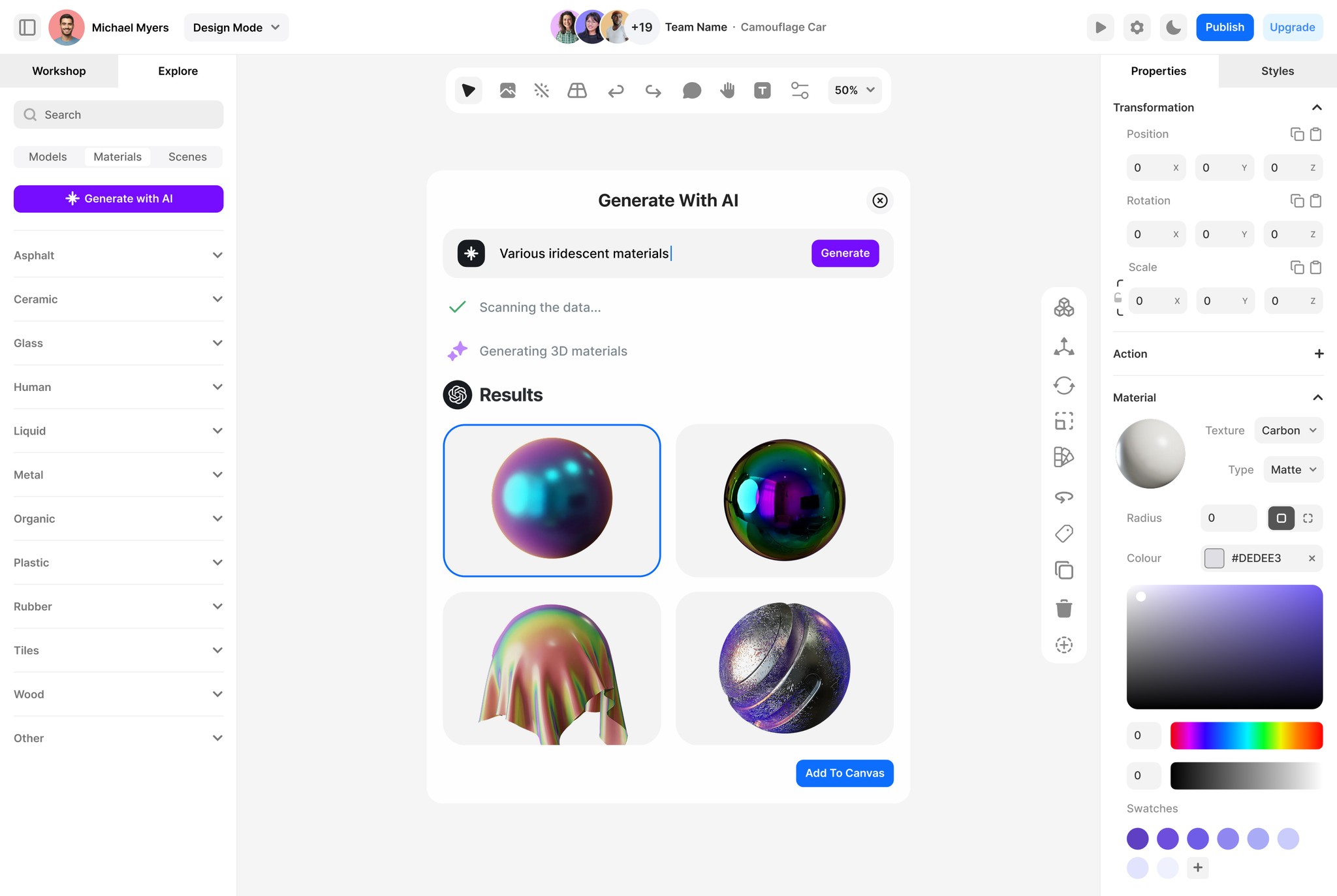 AI-generated textures and materials that match your product specs or creative intent, no need for shader expertise.
