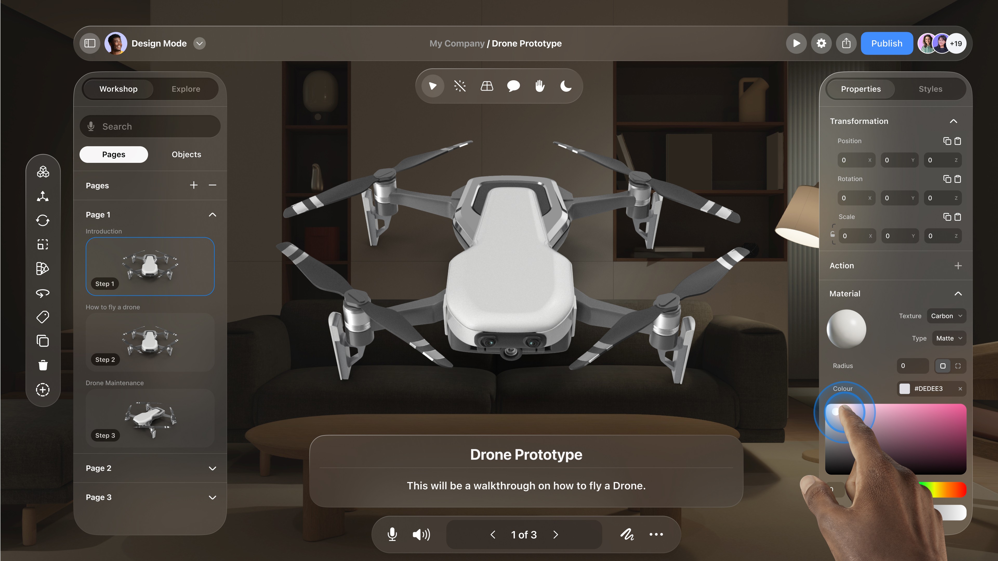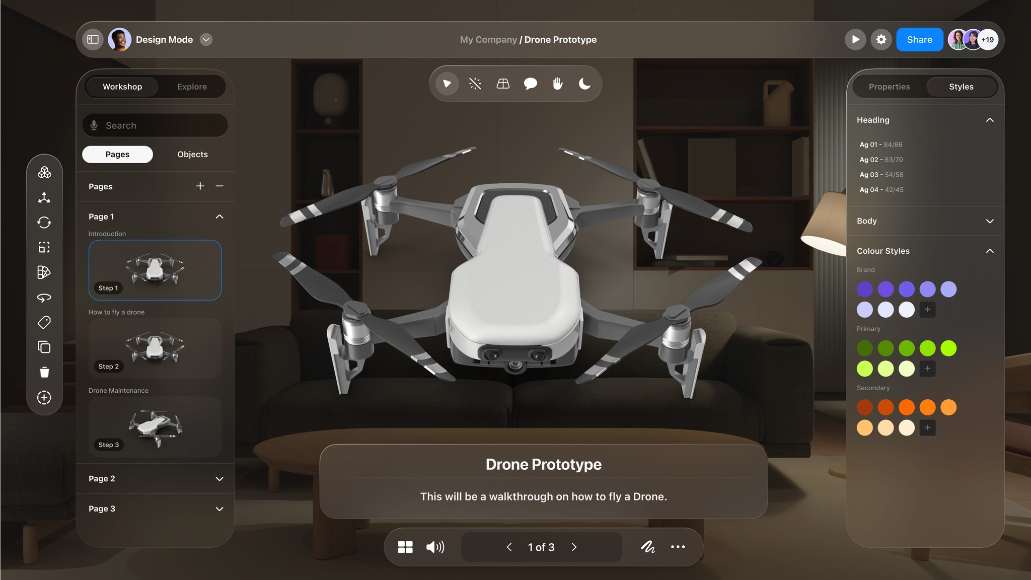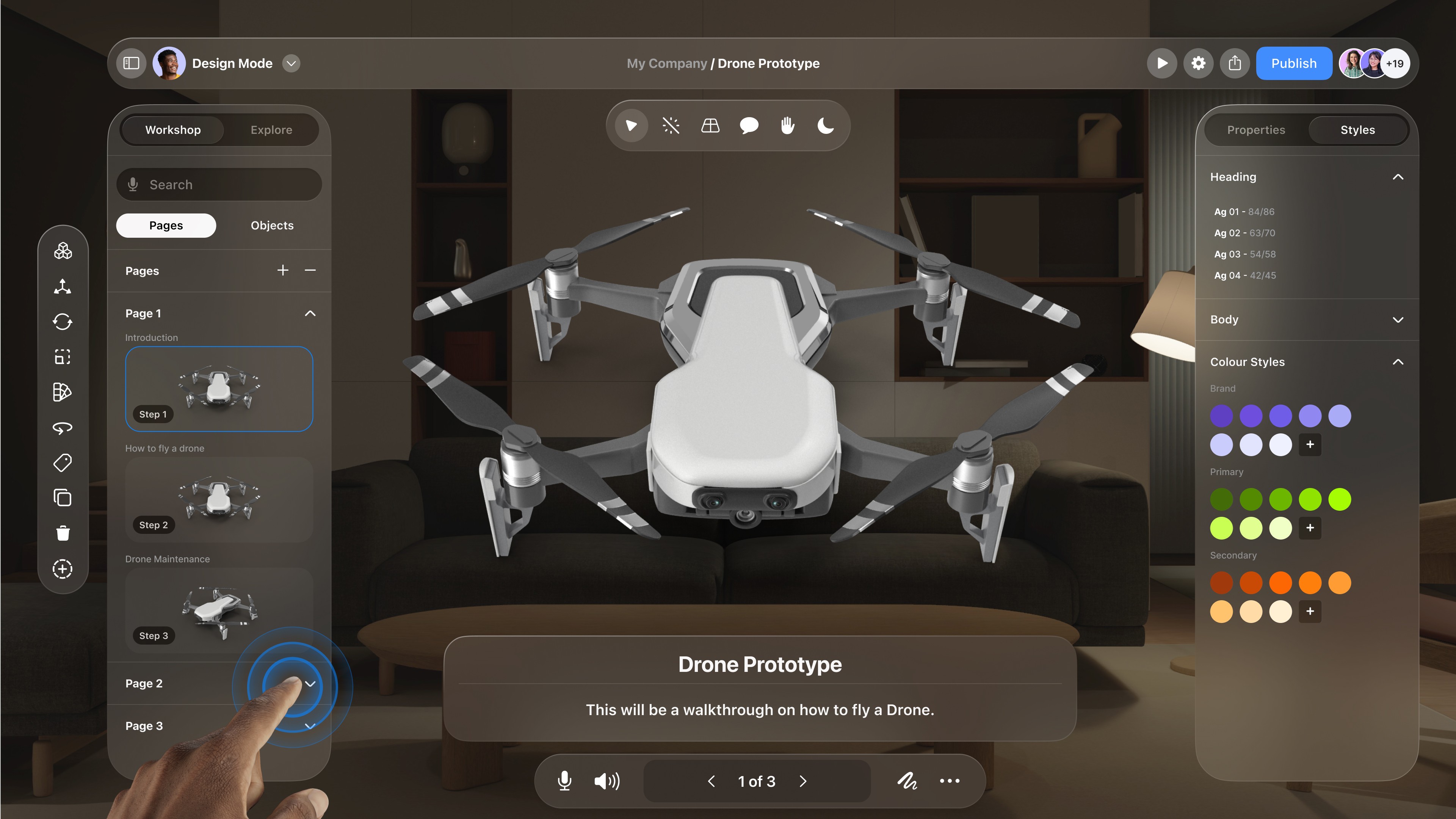 Each Page contains Objects — including 3D models, images, text labels, and annotations. These are the core elements that convey meaning and function. Objects can be positioned, styled, animated, or toggled to guide the viewer through your product or process.